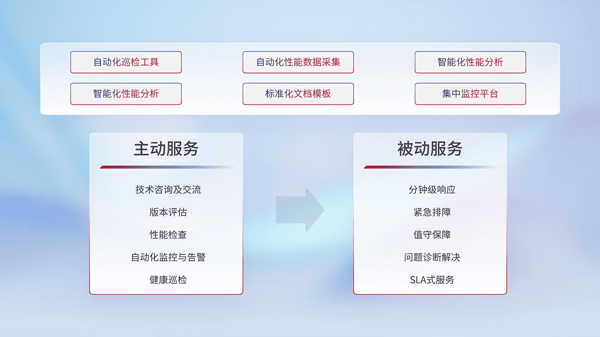 智能化工具和标准化文档,,,保障服务质量,,,,提供主动服务(包含技术咨询、、版本评估、、、性能检查、、、自动化监控与告警、、、健康巡检)和被动服务包含(分钟级响应、、、、紧急排障、、值守保障、、、、问题诊断解决、、、、SLA服务)。。。